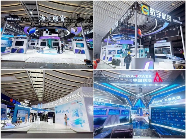 慧展科技公司為多家單位提供展臺(tái)策劃設(shè)計(jì)、施工搭建及運(yùn)營(yíng)保障一體化服務(wù),涉及展臺(tái)面積約 750㎡。中國(guó)電信展臺(tái)延續(xù)“無桁架”綠色搭建概念,將環(huán)保理念貫徹到底;鐵塔展臺(tái)通過數(shù)字化手段以3D模式呈現(xiàn)“數(shù)智鐵塔”;浙江國(guó)資與杭鋼展臺(tái)通過頂部動(dòng)態(tài)LED屏實(shí)現(xiàn)展臺(tái)聯(lián)動(dòng),生動(dòng)詮釋 “星河之力,雙核共生”的創(chuàng)意理念。