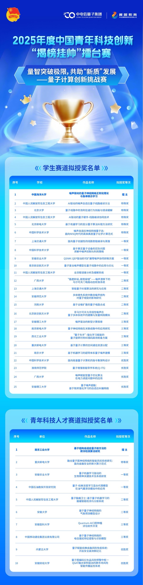 其中,由中國電信發(fā)榜、中電信量子集團(tuán)實(shí)戰(zhàn)運(yùn)營的“量智突破極限,共助‘新質(zhì)’發(fā)展——量子計(jì)算創(chuàng)新挑戰(zhàn)賽”榜題,近百支參賽隊(duì)伍踴躍角逐,最終學(xué)生賽道的25支隊(duì)伍和青年科技人才賽道的10支隊(duì)伍脫穎而出,成功斬獲獎(jiǎng)項(xiàng)。